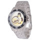 Has heft and feel of expensive stainless steel quartz watches. Good band with safety catch. I removed links, which is easy because engraved arrows show direction to push the linking pins. As always by this seller, the image (a railroad logo) is a perfect reproduction of my emailed image, and is precisely spaced and aligned.