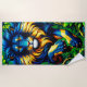 This beach towel has lion artwork on it.
