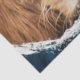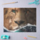 A lion with one blue eye and one orange eye. The lion portrait is half submerged in the ocean.