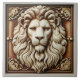 A lion head bas-relief ceramic tile with a majestic and powerful presence. The lion’s head is masterfully sculpted in high relief, emerging boldly from the surface of the tile. The fur is intricately detailed, with each strand meticulously carved to create a sense of texture and depth. The mane is especially striking, flowing outward in dynamic, swirling patterns that radiate around the lion's face, giving the impression of strength and vitality.