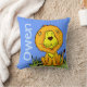 Playful smiling big cat lion throw pillow cushion a perfect newborn gift. Cute pillow looks great in a baby's nursery for nursing or on a kids bed. Customise with your own short name. Currently reads "Owen" Uniquely painted and designed by Sarah Trett.