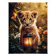 A cute lion boy sitting in the jungle looking directly at you with his big cute eyes. There is a bright lantern in front of him that gives light to the little one and puts him in the right light. A special and cute motif that you just have to hang on your picture wall.