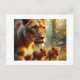 A majestic lioness walks protectively with her two cubs through a sunlit forest. The golden hues and soft lighting create a warm and serene atmosphere.