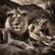 Inspired by renown nature photographer Ansel Adams, this spectacular piece of black and white art depicts a rare moment where an adult male lion and his regal lioness rest on a hill, surveying their kingdom.