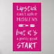 This design features the cute makeup related phrase "Lipstick Can't Solve Problems But It's A Pretty Good Start".