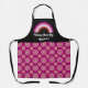 Women's apron with an image of a lipstick lesbian pride flag and a rainbow, and repeating seamless flower pattern; pink, white, and orange design on a black background, with a customisable text template for your own name or message