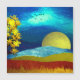 A beautiful abstract landscape design with a unique sky resembling ripples in liquid and a moon, mountains, and a golden tree.