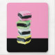 Illustration of a tower of liquorice allsorts candy in pink, green, yellow and white, against a pink background. Delicious for those who love anything sweet!