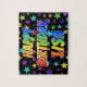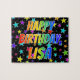 This fun, exciting, birthday-themed jigsaw puzzle design has the message "HAPPY BIRTHDAY, LISA" with the characters having a colourful rainbow spectrum inspired gradient pattern, in addition to a lively stars background pattern. An exciting puzzle like this might be a fun way to send birthday wishes to somebody named Lisa. [~Z0000468]