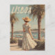 This charming vintage poster depicts a graceful woman in a classic 1950s dress standing at the harbour in Lisbon. Fishing boats gently float on the water behind her, while the sun casts a warm, golden glow over the historic buildings in the background. The soft retro colour palette and nostalgic textures capture the elegance of mid-century coastal life in Portugal. Perfect for lovers of vintage fashion, seaside scenes, and timeless European travel art.