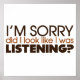 "I'm sorry did I look like I was listening?" - This sassy and attitude-filled t-shirt design is perfect for all those wanting to let people know what they really think.