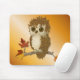 Cute Autumn scene features a little Owl perched on a Maple tree branch with leaves showing fall colours over a golden brown background.