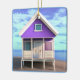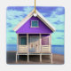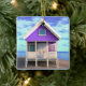 Ornament in a cute little beach shack / vacation house on stilts, painted white and purple, on the sand, with a blue sky and white clouds