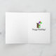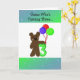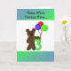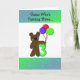 A cute little bear holding a cluster of birthday balloons in red, blue and green. The number 3 under his arm. A border of shaded green and blue accents the top and bottom of card. Customise by changing the message inside or on front as desired.