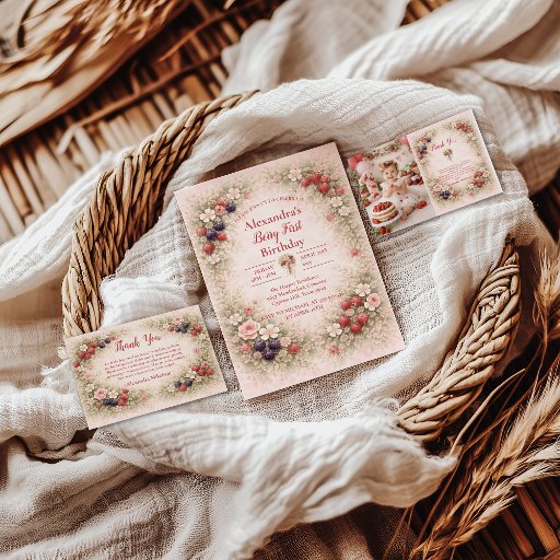 A soft, storybook-inspired berry garden collection created for a sweet first birthday celebration. Featuring strawberries, blueberries, and delicate florals arranged around a warm parchment center, this design blends vintage charm with a romantic garden feel. Ideal for a timeless, elegant, and whimsical berry-themed first birthday.