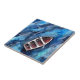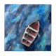 traditional watercolor artwork featuring an empty life boat or rowing boat drifting across a very blue ocean as a decorative ceramic tile.