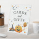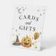 A little boo Halloween pumpkin baby shower cards and gifts pedestal sign. Modern Halloween-themed design for a boo party! This cards and gifts sign features a pumpkin, a witch hat, a balloon, candy corns and stars. This sign is great for baby girls and boys shower parties!