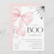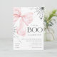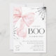 This cute and spooky baby shower invitation features a beautiful watercolor illustration of a pink bow and spider web, perfect for celebrating the upcoming arrival of a little one in the halloween season.