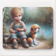 A young boy with blonde hair, wearing glasses and denim overalls, sits holding a fishing rod beside a river with his pet beagle