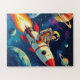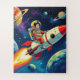 Sci fi puzzle for a little boy's room featuring a little astronaut flying through space on a rocket ship done in a comic book style retro pop art way.