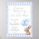 This charming baby shower welcome sign features a cute baby bunny holding balloons and a blue gingham background, and can be personalised with your name and special date. Designed by Thisisnotme©