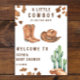 Saddle up! This watercolor cowboy design. This design features modern neutral colours in a watercolor application. Design in cow print, cowboy hat, desert cactus, cowboy boots. "A little cowboy is on the way"