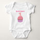 Planning a gift for a baby girl who is turning one? How about this sweet baby one piece that has a cupcake with pink cream with purple wrapper that has a number one on it! The text reads "This Little Cupcake is". Sweet and adorable gift for baby girl's first birthday.
