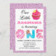 Girly and sweet Little Cupcake purple lilac glitter first birthday invitation with doughnut and candy letters. Easily add your full name, and the date, time and address of the birthday party. Perfect for a sweet little princess turning one!