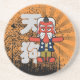 This orange and black coaster features a cartoon drawing of a Daitengu, one of the yokai monsters from the mythology of Japan. The Daitengu is one of the two types of tengu, and is easily recognised by its long nose and red skin. Although tengu can be vicious, this one is cute. The large kanji characters in the background say "Tengu" in Japanese.