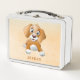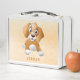 Cute brown and white cartoon puppy over a beige background. Optional monogram