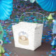 This cute and kawaii boy's birthday favour box features a dumpling with a smiling face and blue hearts in a chinese steamer on a white background with grey wave patterns. Personalise it for your needs. NOTE: Please note that the dimensions of the take-out box are 2"w x 2"l x 2.75”h.