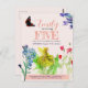 Birthday invitation with a little dandlion fairy and colourful wildflowers . A happy collage of handpainted watercolor paintings for the little one who celebrates her fifth birthday.