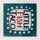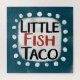 A cute typographic food design that says "Little Fish Taco". It's black and red text on a white rectangle with funky, playful white dots surrounding it, all on a teal background.