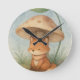 A whimsical watercolor illustration of a small fox taking shelter under a giant mushroom during a gentle rain. With soft, earthy tones and a dreamy atmosphere, this piece captures the quiet magic of a rainy day in the forest.