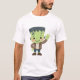 A cute and friendly cartoon drawing of Frankenstein's monster. He has light green skin, rosy cheeks, and jagged black hair. Dressed in a brown jacket, a white shirt, and blue pants, he is cheerfully waving with his hand. The illustration features the character's signature stitches and metal bolts on his head. The background is solid black.