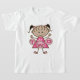 An adorable little girl in pigtails and a pink dress holds a string of letters that spell out "TWO" on 2nd birthday T-shirts, bodysuits, cards, stickers, bags, and much more!