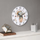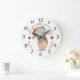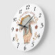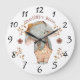 An adorable personalised watercolor little girl elephant nursery or baby nursery or kid's bedroom clock, sporting a cute baby elephant in overalls with hair bow, in hues of grey and orange, on a peach orange pastel watercolor wash brush stroke. The type is a unique decorative font with swashes.