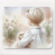 A young girl with short blonde hair, wearing a white blouse, gently holds a fluffy bunny close in watercolor