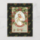 Vintage artwork with a little girl in hooded winter coat. Surrounding area is filled with holly and berries as is a background behind