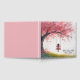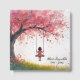 A young girl in a pink dress sits on a swing hanging from a cherry blossom tree for a memorial service or funeral.