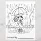 Cute little girl holding an umbrella in the rain. Reflection of her in the puddle. Cute kid's colouring page.