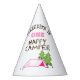 Throw the perfect One Happy Camper themed birthday party for your little girl. These paper party hats have pretty watercolor illustrations of a pink camping tent and green and brown pine trees along with a spot to add the name of your little happy camper.