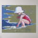 Ever play on the beach with a child? Did you play with the wetness of the waves and the sandiness of the sand? This is a beautiful painting of a little girl playing with the little waves at the edge of the beach is a beautiful gift for your beach comber loved one. She's wearing a red bathing suit and has a big white hat to keep off the sun. The beach baby is happy playing all by herself, totally concentrating on the feel of the slippery water sifting through her hands.