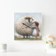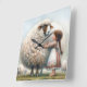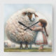 A little girl in a patterned dress is admiring a big sheep with an enormous fluffy fleece
