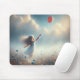 A young girl with long flowing hair holds onto a red balloon in a misty field filled with colourful wildflowers