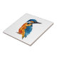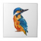 traditional watercolor artwork of a little kingfisher bird in vibrant blue and orange watercolors on a ceramic tile.