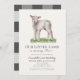 This cute gender-neutral "our little lamb is turning x" birthday invitation features a little lamb on a cream white background. The reverse side features a white background with black buffalo/gingham check/plaid patterns. Personalise it for your needs. You can find matching products at my store.