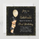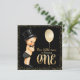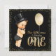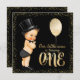 Little man first birthday party invitation with dapper baby boy wearing a top hat, dress shoes, diaper and bow tie on a rich black and gold confetti glitter background. This adorable little man birthday party invitation is easily customised for your event by simply adding your details in the font style and colour and wording of your choice. This is a printed design with no real glitter, foil, etc.