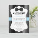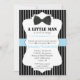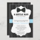 This precious baby shower invitation is a wonderful way to invite your guests to join you in celebrating your new arrival. This design has a black and white pinstripe background with an inset of white and a blue band in the centre. At the top there is a black graphic of a bow tie. Your party details go below centred and are completely customizeable. Just add your Shower details and you are ready to go!
