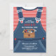 Cute little man birthday party invite featuring adorable blue overalls with a red & white stripe shirt and a toolbox for daddy's little helper.